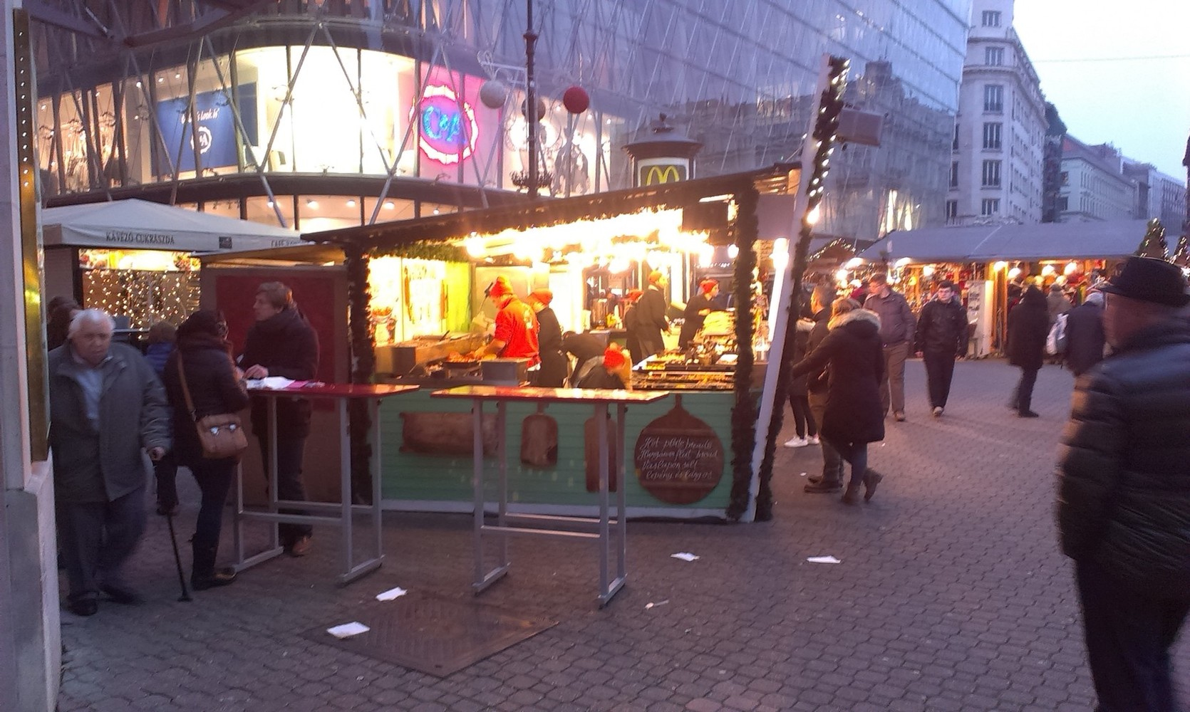 Po krátkom zastavení sa pohodlnou chôdzou / cca 10 min. / presunieme na centrálne námestie Vörösmarty, ktoré je hlavné miesto vianočných trhov. Tu okolo vianočne vyzdobeného stromčeka, ktorý má každý rok inú tematiku, sa nachádzajú drevené stánky, ktoré ponúkajú nie len vychýrenú maďarskú kuchyňu - klobásu, kolienko, perkelt, dokonca aj lososa.
